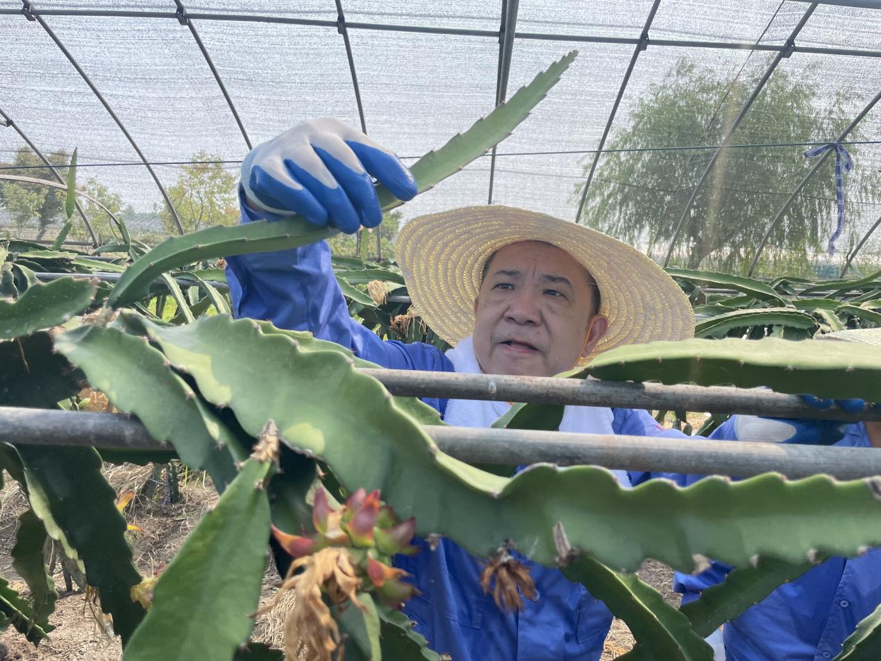 芦董先行来到农场废弃物资源化利用中心,和工人一起粉碎玉米秸秆,详细了解有机肥制作生产情况;随后来到玻璃温室大棚,仔细询问种子育苗情况以及花卉种植品种;在无土栽培、热带果树种植区域,芦董饶有兴趣地参观了芒果、龙眼等热带果树,并实地了解无土栽培水肥配比,实测水肥溶液浓度,对科学种植表示肯定;今天的优家农场,仍然骄阳似火,在池塘边柳树的树荫下,喝口水、擦把汗,随即前往火龙果地进行疏果、压枝,尽管棚内炎热,芦董表示出出汗,体会劳动的艰辛十分必要;最后,芦董来到玉米地,和工人一起亲手种下玉米苗,芦董强调粮食来之不易,保粮食是国家大事,我们要遵循规律,敬畏自然!