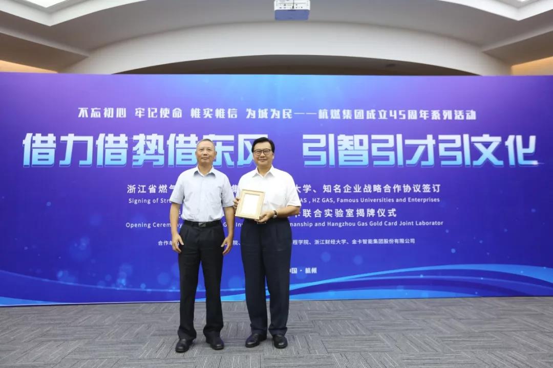 中燃协理事长刘贺明为香港中华煤气有限公司行政总裁、港华燃气有限公司董事会主席陈永坚颁发杭燃匠心学院名誉院长聘书。