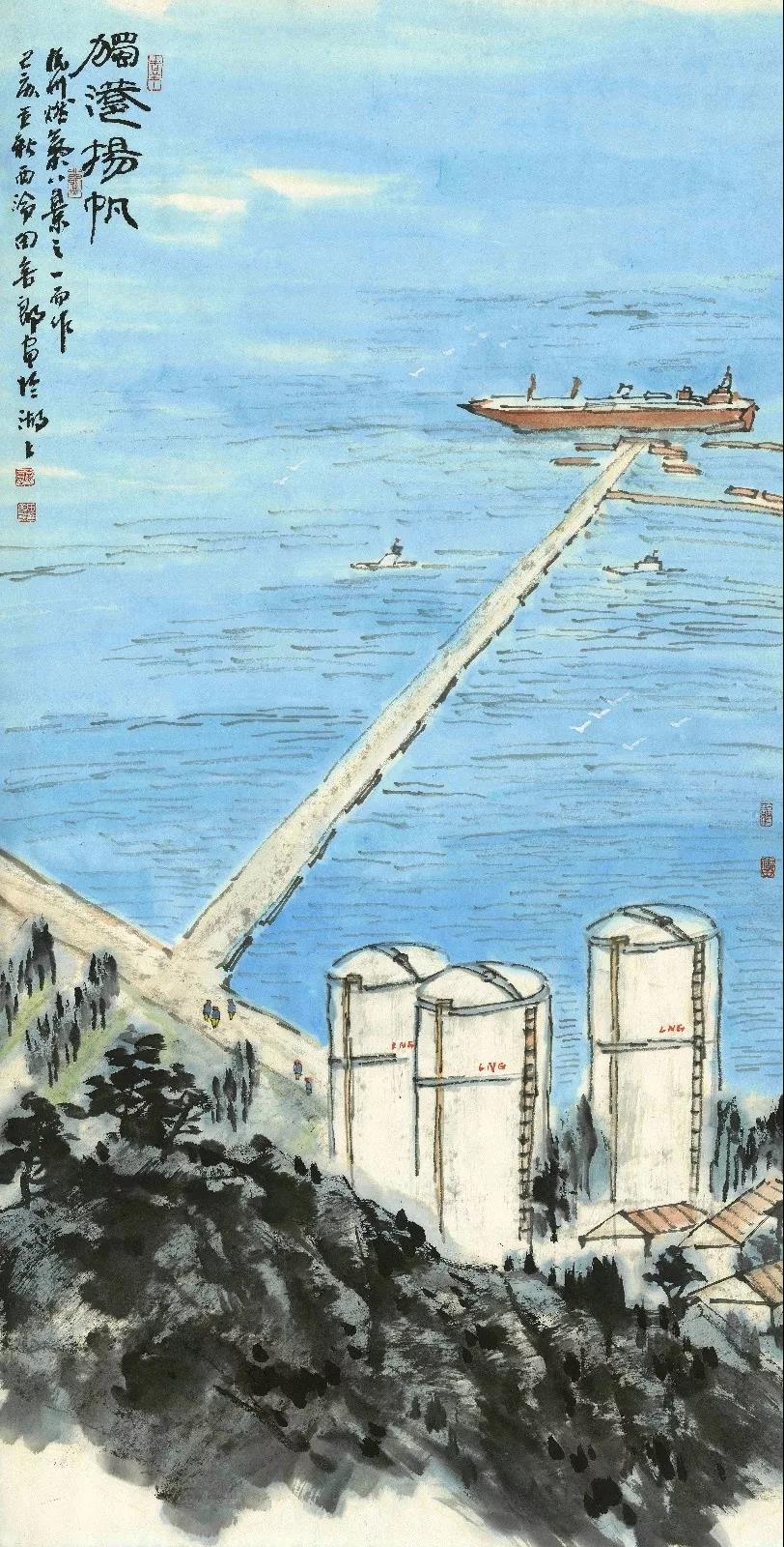 组成元素:船舶、海、港口、LNG罐体、建筑物等。