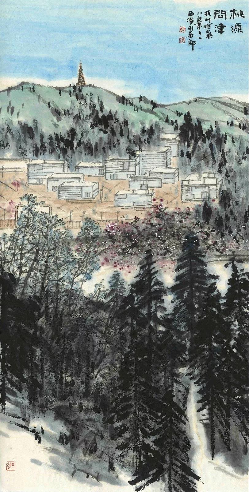 组成元素:储配站和研发中心、山、树木、桃树等。